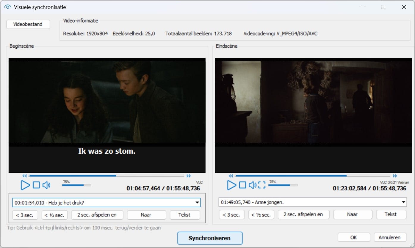 Een alternatief is Synchroniseren / Visuele synchronisatie. Kies daarbij de juiste ondertitel (via Tekst) bij het begin van de scène en eventueel een tweede bij het eindpunt. Met de knop Synchroniseren worden de overige tijdcodes verhoudingsgewijs aangepast.