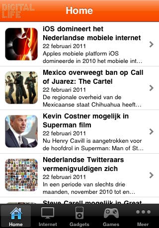 De app is logisch ingedeeld en geeft een volledig nieuwsoverzicht wat je later makkelijk kan opdelen in categorieën. De drie hoofdcategorieën zijn internet, gadgets en games. Daarnaast kun je op de button 'meer' klikken en kun je ook nieuws lezen over muziek, film en Digital Life zelf.