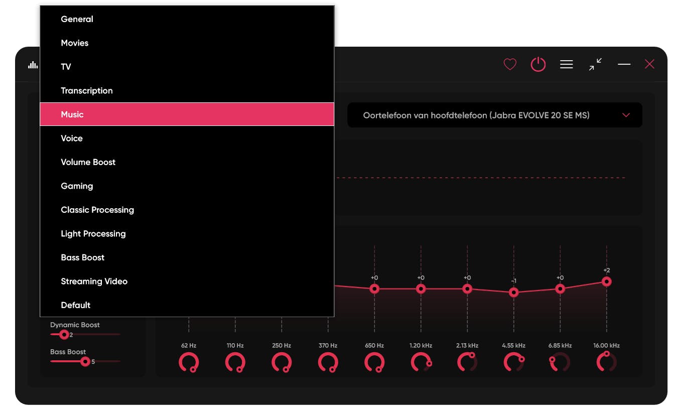 Bij iedere preset die je selecteert, kun je aan de linkerkant vijf verbeterregelaars gebruiken: Clarity, Ambiance, Surround Geluid, Dynamic Boost en Bass Boost. Met Clarity pas je voornamelijk de hoge tonen aan, waarmee je gedempte audio herstelt. Ambiance voegt een breder geluid toe. Bij Surround Geluid lijkt het alsof je omgeven bent door audio, ideaal voor films en games. Dynamic Boost maakt de zachte delen luider. En Bass Boost voegt een krachtige, energieke bas toe. Elke regelaar werkt met een eenvoudige schuifregelaar. Daarnaast zie je een 10bands-equalizer met cirkelvormige regelaars van 62 Hz (sub-bas) tot 13.000 Hz (hoge tonen). Door de grafische weergave begrijp je gemakkelijk hoe je de equalizer kunt gebruiken.