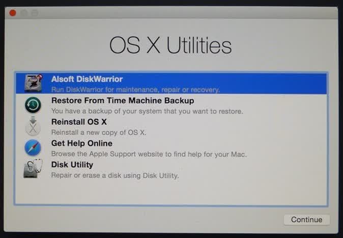 DiskWarrior nestelt zich in het OS X Utilities-venster als je het programma vanaf een flashdrive opstart.