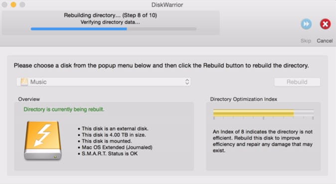 De snelheid waarmee DiskWarrior werkt, hangt af van het type en het formaat van je schijf. Het duurde slechts vijf minuten om de SSD van mijn Retina iMac te doorlopen. Toen ik de directory van mijn Time Machine-schijf wilde optimaliseren, duurde het echter een uur, en het gebruikte zo'n 10GB aan RAM. (Dit is niet ongebruikelijk. Vanwege de manier waarop Time Machine werkt bevat een schijf als deze enorm veel bestanden.) Maar DiskWarrior 4 kon vaak een Time Machine-schijf helemaal niet repareren vanwege het grote aantal bestanden. Aangezien DiskWarrior 5 gebruik maakt van 64-bit-geheugenadressering kan het nu zulke grote directories aan.