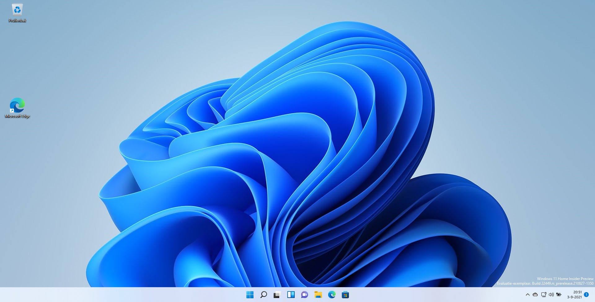 Tijd voor het besturingssysteem zelf, want Windows 11 bevat een paar mooie vernieuwingen. Het eerste wat opvalt, is het vernieuwde uiterlijk. Dat zie je direct nadat je het besturingssysteem voor de eerste keer opstart; de pictogrammen op de taakbalk staan nu in het midden in plaats van links, er zijn nieuwe pictogrammen aan de taakbalk toegevoegd en het bureaublad is voorzien van een nieuwe achtergrond.