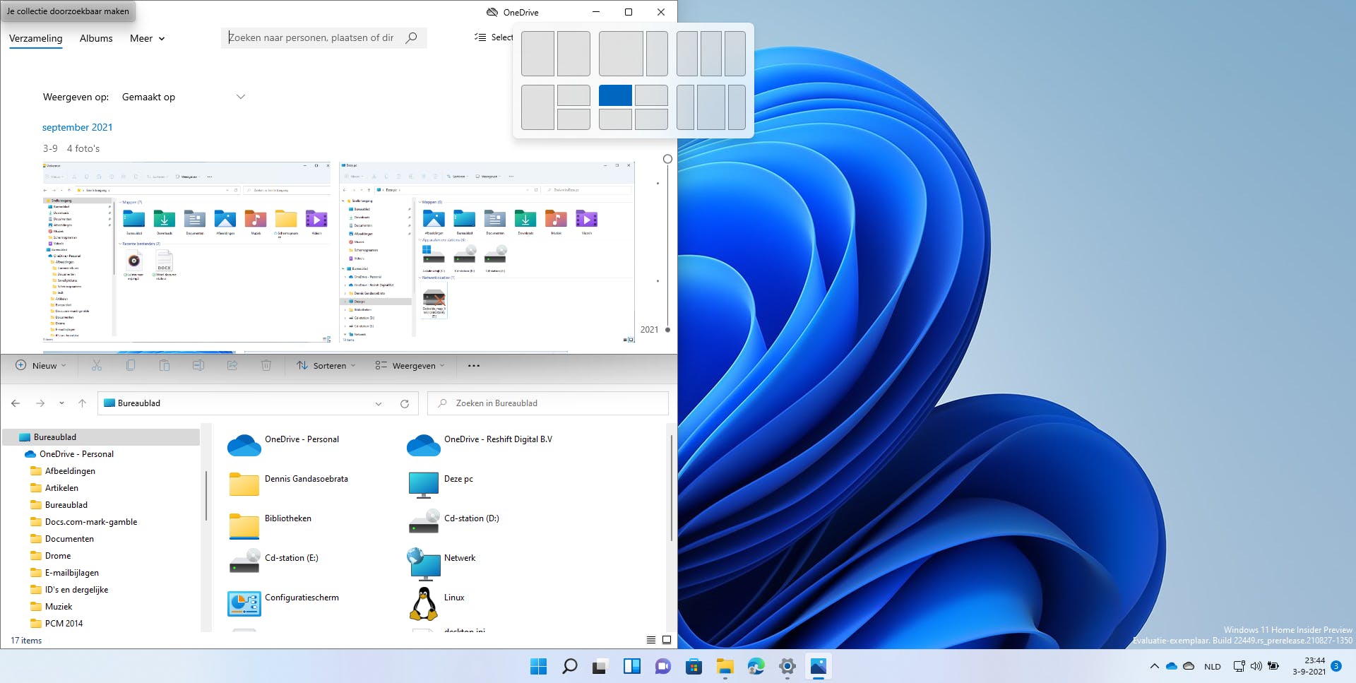 Snap Layouts is een functie die in Windows 11 wat verder ontwikkeld is dan wat je er in Windows 10 mee kon. Je kunt hiermee namelijk een geopend venster met één muisklik op de gewenste positie op het scherm plaatsen ten opzichte van andere vensters. In Windows 10 moest je hiervoor nog de Windows-toets en een van de pijltjes gebruiken. Om de Snap Layouts-functie te gebruiken, hoef je alleen nog maar met de muis over de Maximaliseren-knop van het venster te zweven. Er verschijnt dan een klein venster waarin je de nieuwe positie kunt aanklikken. Zodra je de gewenste positie gekozen hebt, wordt het venster daar geplaatst en laat Windows 11 de andere beschikbare vensters zien. Klik je dan op een van die andere vensters, dan wordt dat venster naast, boven of onder het huidige venster geplaatst. Op die manier kun je dus sneller je scherm indelen wanneer je meerdere programmavensters tegelijk nodig hebt.
