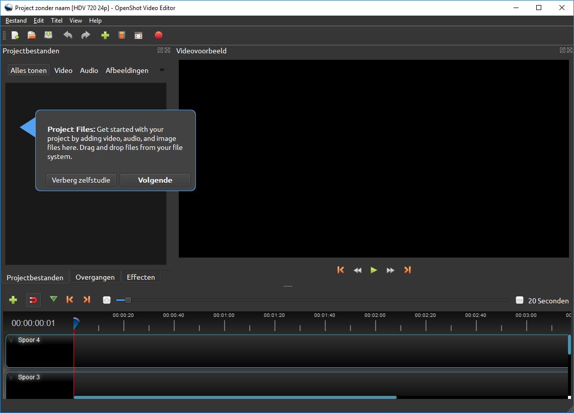 In tegenstelling tot Windows Movie Maker is OpenShot Video Editor voor meerdere platformen beschikbaar. Op de downloadpagina van OpenShot zijn er namelijk edities voor Linux, macOS en natuurlijk Windows te vinden. In dit artikel besteden we aandacht aan de Windows-editie. De installatie bevat geen bijzonderheden, dus je kunt alle standaardstappen doorlopen. Zodra je het programma voor de eerste keer opent, komt OpenShot Video Editor met een zelfstudiemodus op de proppen. Door de uitleg te lezen en telkens op Volgende te klikken, leer je alvast de basiskenmerken van de freeware kennen. Houd er rekening mee dat de uitleg Engelstalig is. Op wat onvolkomenheden na is de interface van deze videobewerker gelukkig Nederlandstalig.