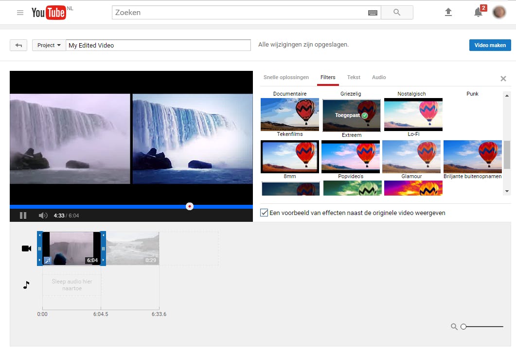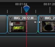Je kunt videoclips op de tijdlijn inkorten, zodat je saaie beelden uit de filmmontage weglaat. Bepaal met de rode schuifregelaar op de tijdlijn het kantelpunt van de video. Wil je het laatste gedeelte wissen? Klik aan de rechterkant van het videofragment op het blauwe verticale lijntje waarbij de cursor verandert in een pictogram met aan weerszijden twee pijltjes. Beweeg de cursor met ingedrukte muisknop naar links totdat je de rode schuifregelaar bereikt. Wil je juist het eerste gedeelte uit de video verwijderen? Dan klik je aan de linkerkant van het fragment op het blauwe lijntje en beweeg je de cursor naar rechts.