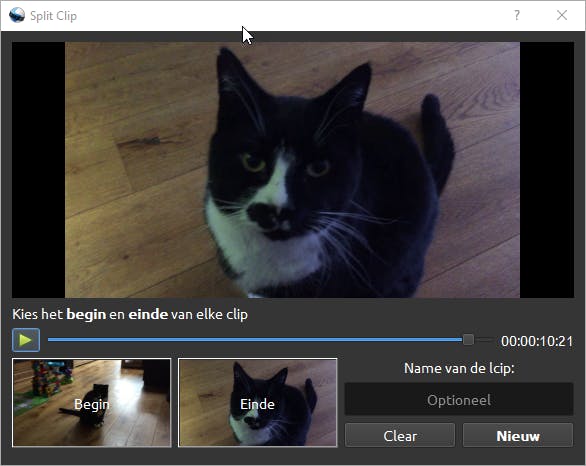 Er is een alternatieve manier om een videoclip in te korten, namelijk door een fragment te splitsen. Je stelt hiermee een begin- en eindpunt in, zoals je wellicht nog wel weet van Windows Movie Maker. Klik met de rechtermuisknop op een videobestand in het deelvenster Projectbestanden. Kies vervolgens voor de optie Split clip. Je beweegt de schuifregelaar naar het begin van het fragment dat je wilt gebruiken. Bevestig met Begin en zet de schuifregelaar vervolgens op het eindpunt. Nadat je op Einde hebt geklikt, bedenk je voor dit ingekorte videobestand een naam. Klik als laatste op Nieuw.