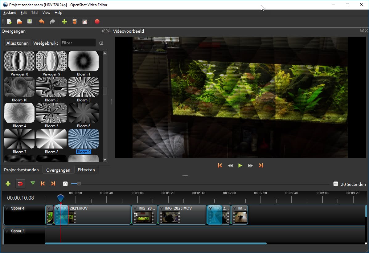 Wanneer je verschillende videoclips aan elkaar rijgt, ontstaan er nogal harde overgangen. Het is mooier om fragmenten vloeiend in elkaar over te laten lopen. In Windows Movie Maker gebruikte je hiervoor het tabblad Animaties, maar gelukkig heeft ook OpenShot Video Editor hiervoor genoeg mogelijkheden in huis. Klik onder het deelvenster Projectbestanden op de optie Overgangen. Het programma bevat allerlei exotische sjablonen van mooie overgangen. Wil je niet te gek doen, dan klik je bovenaan op Veelgebruikt. Klik op een overgang en kies met ingedrukte muisknop de gewenste positie op de tijdlijn. Dat kan ‘bovenop’ bestaande videofragmenten. Bij de meeste sjablonen voeg je de overgang helemaal aan het begin van een videoclip toe. Klik onder het videovoorbeeld op de knop Afspelen om het resultaat te bekijken.