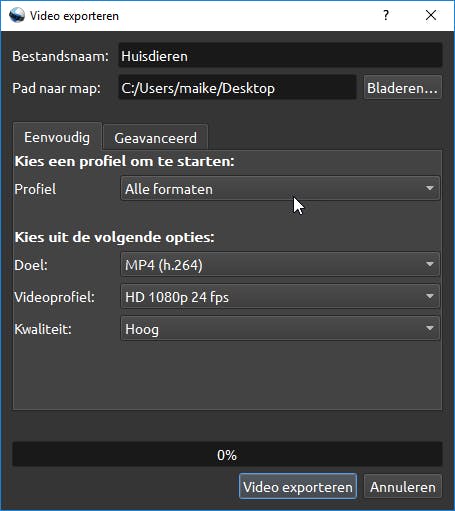 Ben je volledig tevreden met de montage? Hoog tijd om de uiteindelijke film op te slaan. Ga naar Bestand / Video exporteren en bedenk voor het project een toepasselijke naam. Je selecteert via Bladeren de juiste opslaglocatie. Bij Profiel laat je de optie Alle formaten ongewijzigd. Vergeet verder niet om achter Doel het gewenste uitvoerformaat te selecteren, bijvoorbeeld MP4 (h.264) of AVI (mpeg4). Deze keuze hangt sterk af van de bestandscompatibiliteit van het apparaat waarop je de film wilt afspelen. Je kiest bij Videoprofiel de resolutie en de framesnelheid. Zorg ervoor dat deze waarden overeenkomen met de filmeigenschappen van de gebruikte camera. Als laatste stel je de gewenste kwaliteit in, waarna je bevestigt met Video exporteren.