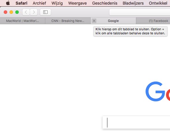 Elk tabblad heeft een klein kruisje in de linkerhoek als je er met de muis overheen beweegt. Klik op het kruisje om één tabblad te sluiten. Wil je liever je toetsenbord gebruiken, druk dan op Cmd-T om een tabblad te sluiten.