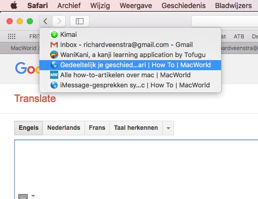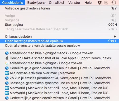 Oeps! Je hebt iets te snel op Cmd-W gedrukt en nu is je tabblad afgesloten. Geen probleem, in het menu van Safari ga je naar Geschiedenis en kies je voor de optie Open laatst gesloten tabblad opnieuw. De toetscombinatie hiervoor is overigens Shift-Cmd-T.