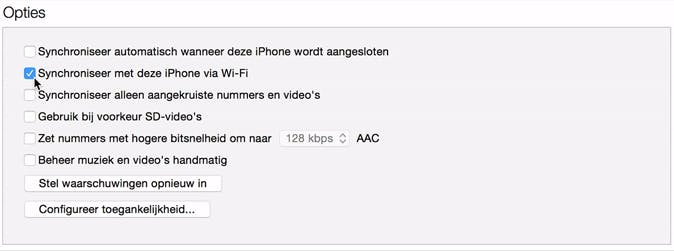 Ga op je computer naar iTunes, selecteer het apparaat in kwestie en klik op Overzicht. Ga naar Opties, zet een vinkje bij Synchroniseer deze [apparaat] via Wi-Fi en bevestig je keuze door op Pad toe of Synchroniseer te drukken.