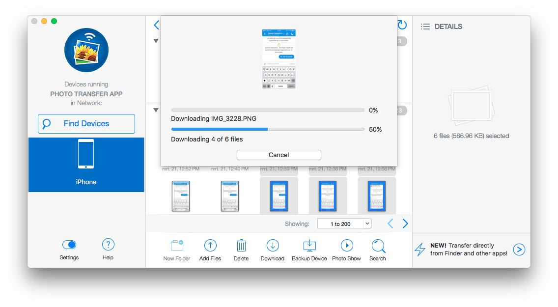 Je kunt ook meteen vanuit de Finder foto's naar je iPhone sturen. Klik voor een korte instructie in de Mac-app op New! Transfer directly from Finder and other apps! Ga naar de Finder en selecteer een afbeelding. Met je rechter muisknop kies je voor Deel en klik je op de optie Meer...