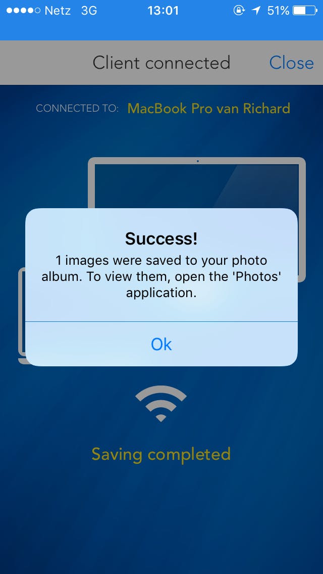 Kies voor Upload en de afbeelding wordt naar je iPhone gekopieerd. Op je iOS-apparaat verschijnt nu de melding dat de afbeelding op je iPhone is opgeslagen.