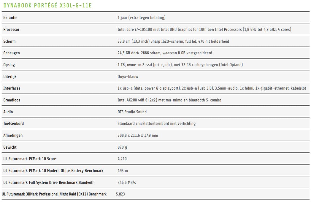 In de UL Futuremark PCMark 10-batterijtests noteerden wij een autonomie van bijna tien uur tijdens kantoorwerk, bijna zevenenhalf uur bij het bekijken van video’s en nipt tweeënhalf uur tijdens het spelen van games. Dat stemt grotendeels overeen met wat Dynabook zelf vermeldt. Een flinke werkdag moet deze accu het gemakkelijk kunnen uithouden. De overige prestaties zijn wat je mag verwachten van het uitrustingsniveau. De Intel Octane-ssd presteert overigens opvallend sterk.