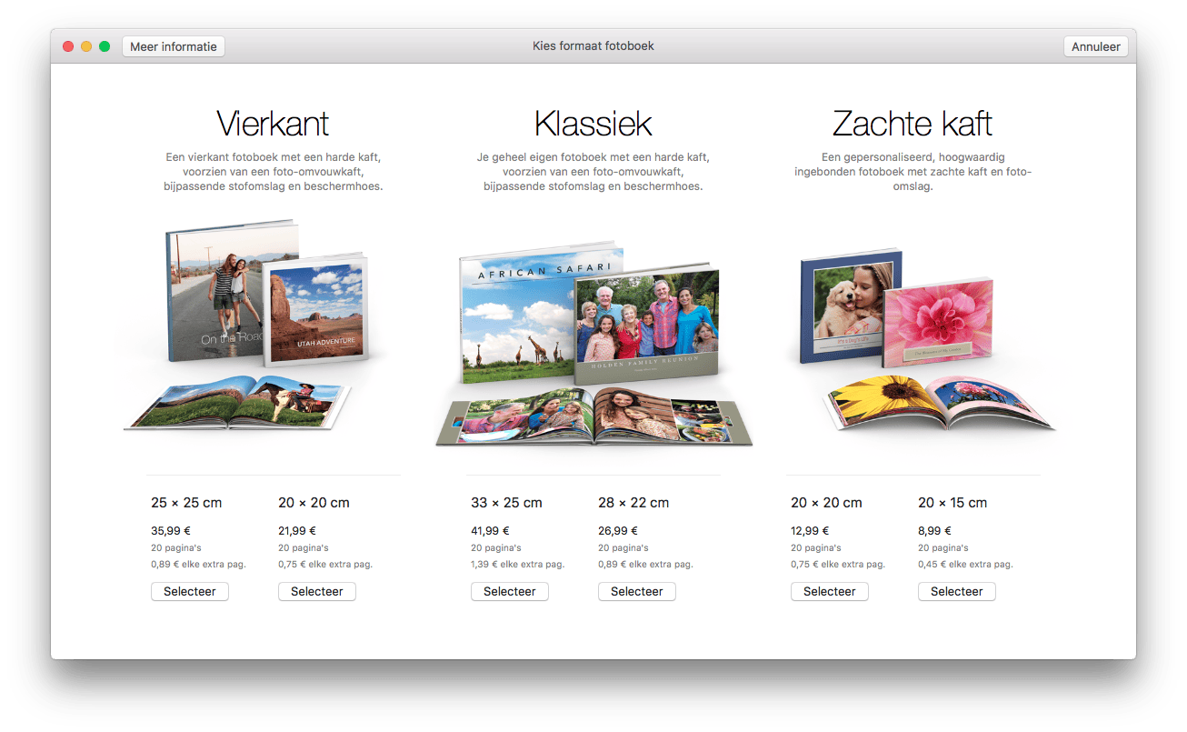 Zorg dat je het juiste album hebt geselecteerd en ga naar Archief / Maak fotoboek aan. In het volgende scherm geef je aan wat voor soort fotoboek je uiteindelijk in handen wilt hebben. Je hebt drie opties: Vierkant, Klassiek of Zachte Kaft. Je ziet meteen hoe veel een fotoboek gaat kosten, per optie heb je twee formaat-opties. Klik op Selecteer om een optie te kiezen. Je kunt later overigens nog pagina’s toevoegen.