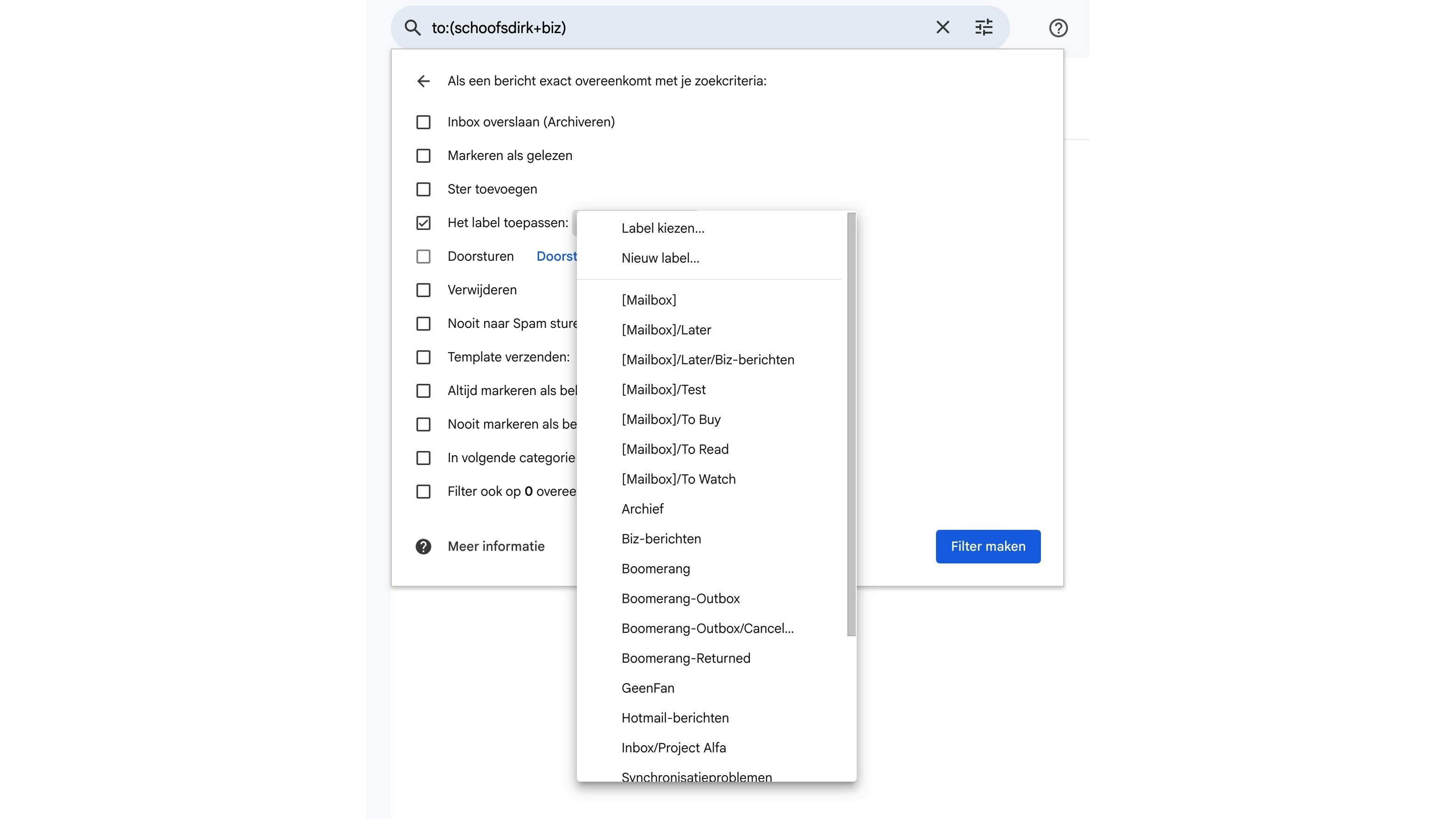 Stel dat je e-mailadres janpeeters@gmail.com is. Dan zullen ook alle berichten naar janpeeters+shopping@gmail, janpeeters+werk@gmail of janpeeters+biz@gmail in je gewone inbox belanden. Je kunt dus eenvoudig een plusteken gevolgd door een woord toevoegen voor @gmail.com.