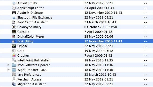 In Applications, scrol omlaag naar de map Utilities en open de Disk Utility applicatie. Of zoek naar de applicatie met de ingebouwde zoekfunctie van OS X.
