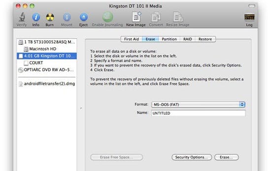 Op het tabblad Erase moet je zorgen dat er in het veld Format de tekst MS-DOS (FAT) wordt weergegeven. Je kunt je USB-stick ook een naam geven in het veld eronder.