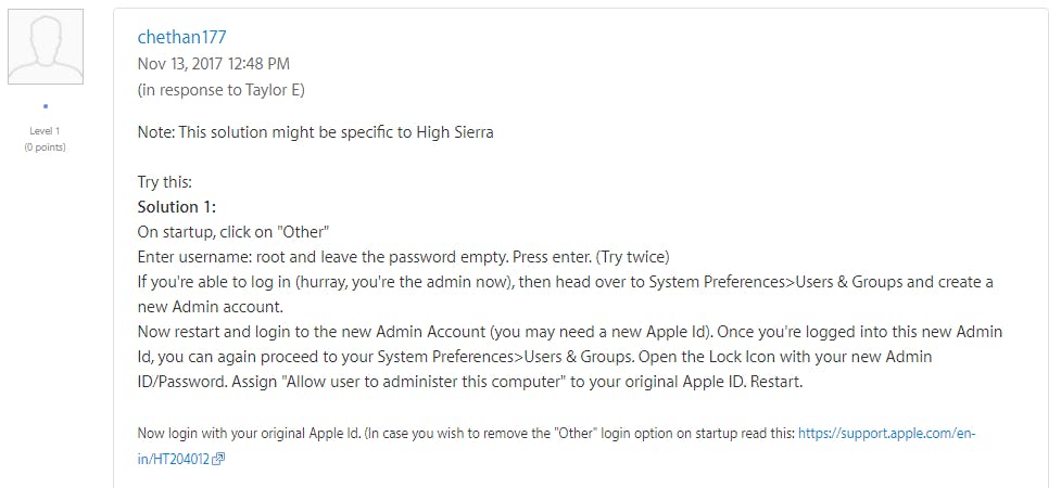 Het beveiligingslek werd al eerder genoemd in het forum op de ontwikkelaarspagina van Apple. Daar werd het op 13 november genoemd als een eenvoudige manier om een nieuwe beheerder op macOS aan te maken.