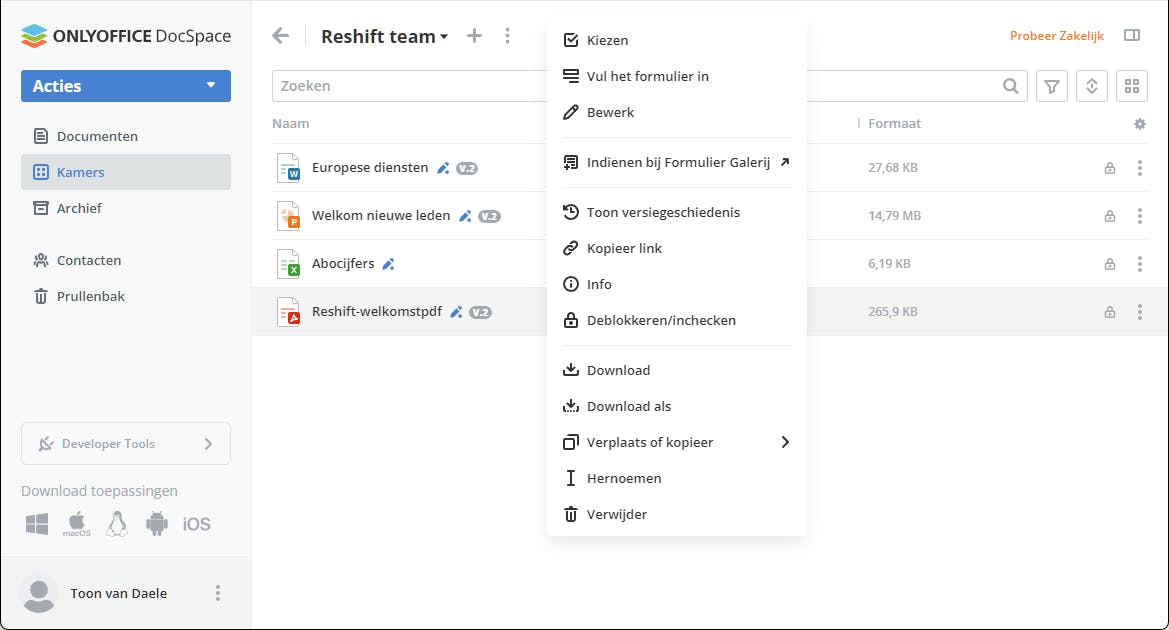 We stellen hier kort de gratis cloudservice voor, bereikbaar vanuit je browser en via mobiele apps. Registreer je via de website van OnlyOffice en bevestig je aanmelding via de ontvangen mail. Je krijgt dan een persoonlijke url (https://<accountnaam>.onlyoffice.com) die als centrale documentenhub fungeert, met 2 GB opslagruimte. Je kunt er 'kamers' aanmaken. Dit zijn virtuele ruimtes of projectmappen waarin je documenten creëert, bewerkt en eventueel deelt met rolgebaseerde toegangsrechten.