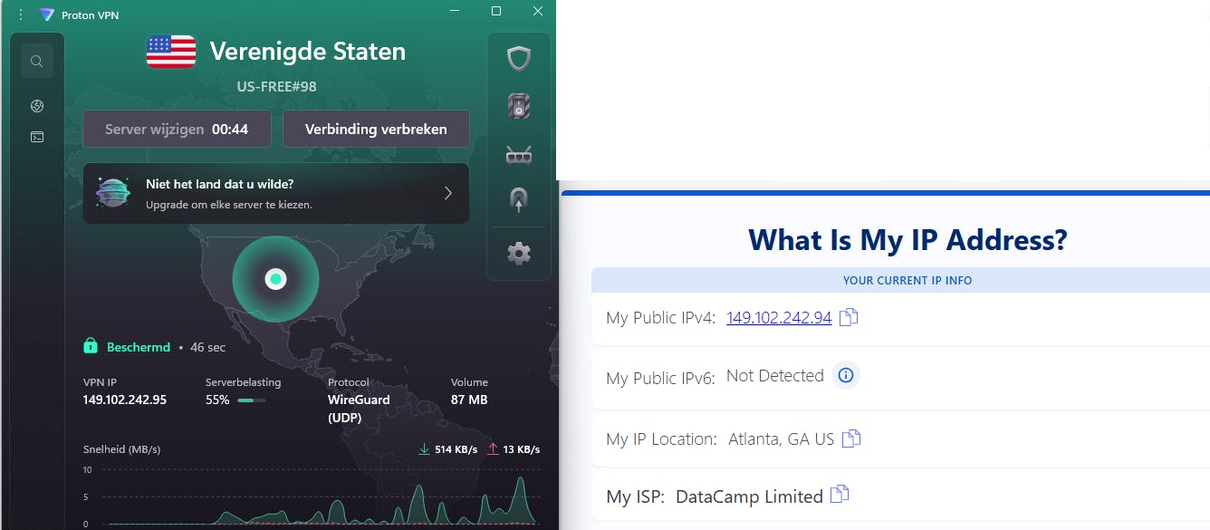 Proton VPN biedt tevens een beperkte gratis versie, handig om mee te starten. Surf naar de site van Proton VPN, vul je e-mailadres in, klik op Begin met Proton VPN en stel een sterk wachtwoord in (twee keer). Je kunt meteen de client-app downloaden, bijvoorbeeld voor Windows. Installeer die (extra apps hoef je niet mee te nemen) en meld je aan met je Proton-account. Kies een VPN-server in een beschikbaar land (vijf in de gratis versie), klik op Verbinden en test de VPN-verbinding gerust via bijvoorbeeld www.whatismyip.com. Of nog beter (in het kader van dit artikel) www.watismijnip.nl/.