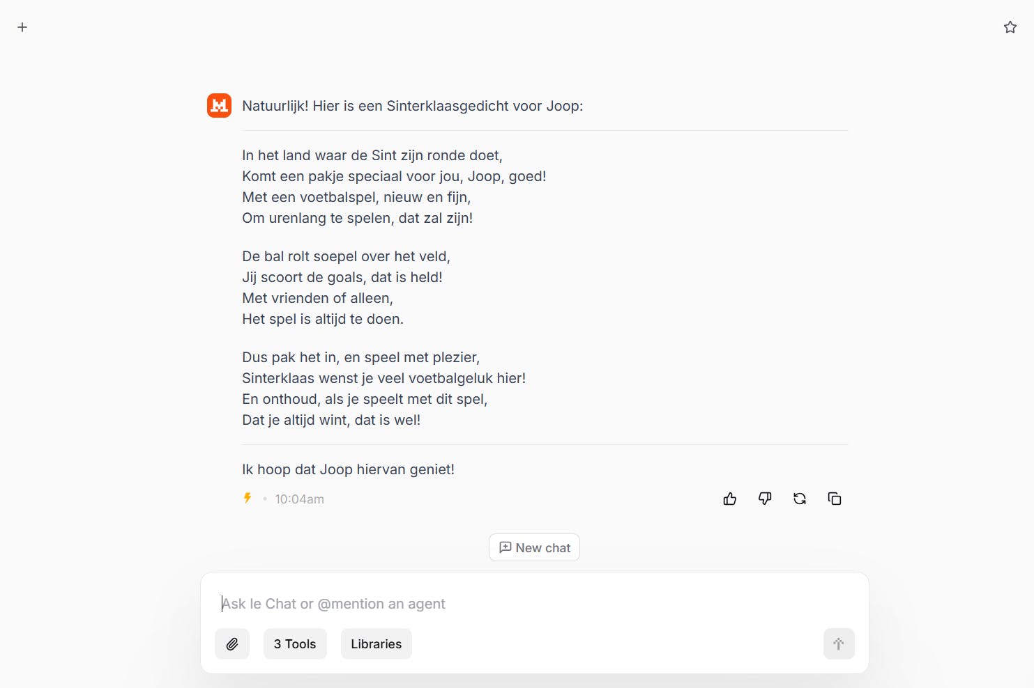 Voor de privacy is Le Chat dus een interessante keuze, maar hoe presteert Mistral in vergelijking met de concurrentie? Uit onze eigen tests blijkt dat Le Chat op de eerste plaats nog niet zo heel vaardig is in het Nederlands. Bij het schrijven van een Sinterklaasgedicht komt de chatbot met veel kromme zinnen, terwijl ChatGPT (naast wat rare rijmpjes) wel consequent kloppende zinnen aan elkaar rijgt. Datzelfde geldt voor zaken die de Nederlandse cultuur aangaan. Als we vragen om suggesties voor klassieke verjaardagshapjes, zegt Le Chat dat we miniquiches en sushi moeten serveren. ChatGPT begrijpt de opdracht beter en raadt ons oer-Hollandse blokjes kaas met mosterd, leverworst en haring op roggebrood aan.