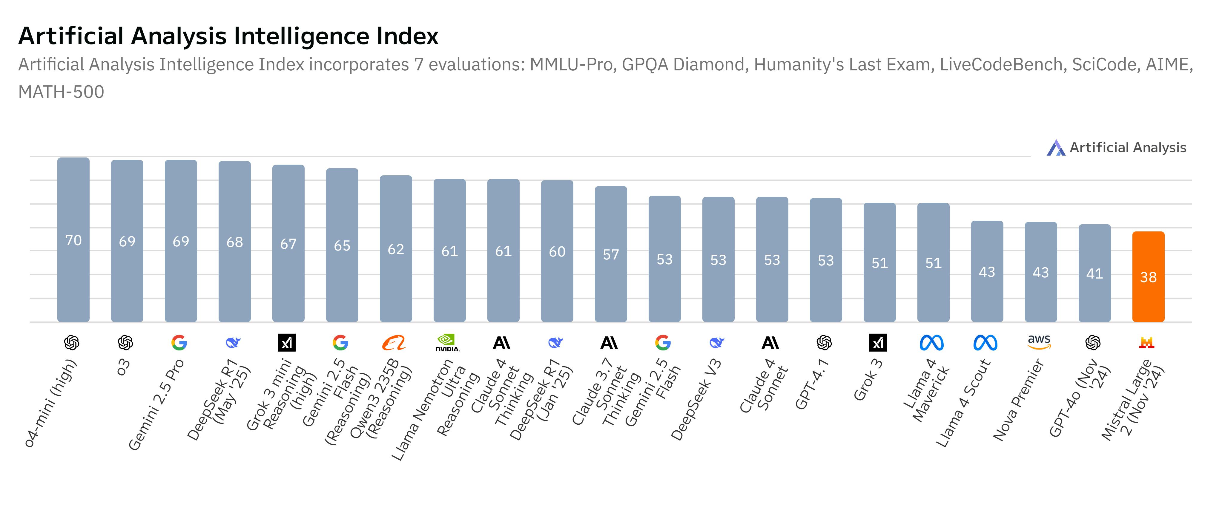 Mistral Large 2, het model dat momenteel voor Le Chat wordt gebruikt, krijgt van de grootste AI-vergelijkingssite, Artificial Analysis, een gemiddelde intelligentiescore van 38. Vrijwel alle andere AI-chatbots behalen hogere scores. Het huidige standaardmodel van ChatGPT, GPT-4o, verschilt met zijn score van 41 niet veel van Le Chat. Alleen OpenAI biedt ook een Pro-abonnement aan voor 24 dollar waarmee gebruikers toegang krijgen tot geavanceerdere modellen, zoals o3, die juist een topscore van 69 behaalt.