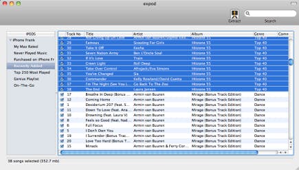 Sluit uw iPhone of iPod aan, sluit eventueel iTunes af en start Expod vervolgens. U hebt dan direct toegang tot al uw muziek, inclusief de afspeellijsten. Selecteer de gewenste bestanden en stel ze veilig met een klik op Extract. Kies vervolgens een sjabloon voor de bestandsnamen en een map waar u alles in wilt opslaan. Het programma lijkt even vast te lopen, maar na een tiental seconden geduld worden alle nummers gekopieerd.