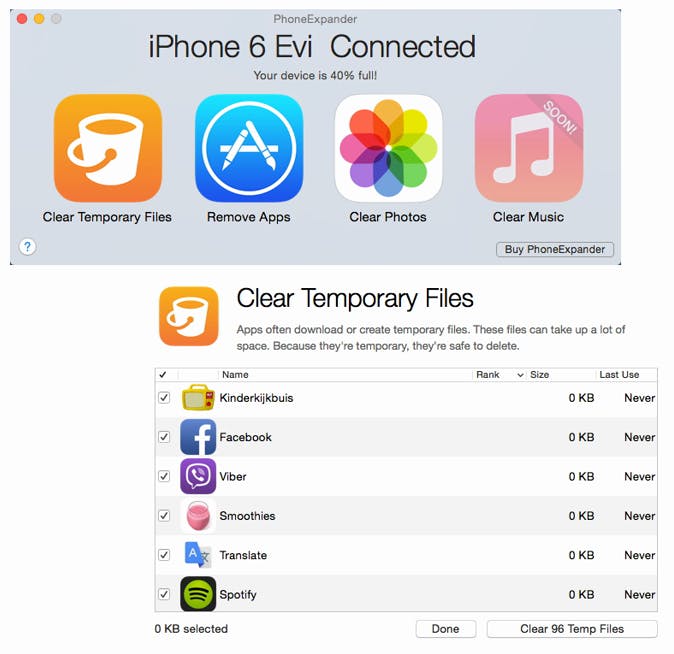 Zodra de software geïnstalleerd is, krijg je de vraag om je iOS-apparaat te verbinden met je computer via de usb-kabel. Met behulp van de knop Clear Temporary Files krijg je een overzicht van alle tijdelijke bestanden die op je iPhone staan opgeslagen. Je kunt aanvinken van welke apps je de tijdelijke bestanden wilt verwijderen of je gebruikt Clear x Temp Files om ze allemaal in één keer weg te werken. Klik op Done om terug te keren.