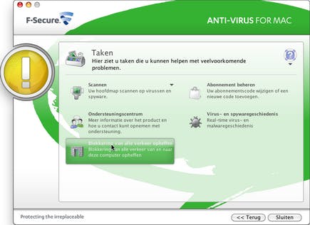 Het belangrijkste onderdeel is Taken. Hier kunt u kiezen voor het scannen van de Mac of delen daarvan en biedt het een centrale plek met informatie over het product en het krijgen van ondersteuning. Verder kunt u hier de historie van aangetroffen virussen en spyware nakijken en stopt u in geval van nood alle netwerkverkeer van en naar de Mac met één klik op de knop Onderbreken. Voor de belangrijkste taken hoeft de gebruiker overigens niet het onderdeel Taken te openen, de mogelijkheid tot het scannen en krijgen van ondersteuning staat ook direct op de startpagina van F-Secure Anti-Virus for Mac.