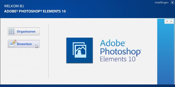 Koopt u Photoshop Elements, dan zit daar de Organizer bij inbegrepen. Dit is een extra programma waarmee u uw foto's van uw camera naar uw computer kunt overzetten en ze vervolgens kunt bekijken en ordenen. In dit artikel laten wij de Organizer voor wat het is en concentreren ons volledig op het bewerken van de foto's. Start het programma op via het pictogram op het bureaublad of open het via Start / Alle programma's / Adobe Photoshop Elements 10. Als de bewerker niet meteen start en u eerst een welkomstscherm tegenkomt, klikt u daar op Bewerken.