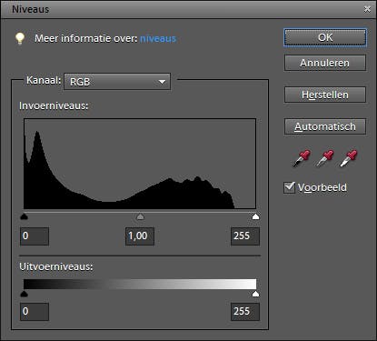 Een over- of onderbelichte foto herstelt u door met de driehoekjes onder de grafiek te spelen. Het idee is dat u de lege gebieden links en rechts naast de grafiek buitenspel zet door op het witte of het zwarte driehoekje te klikken en dit met ingedrukte muisknop naar de voet van de berg te verplaatsen. U doet dat alleen aan de zijde waar de grafiek plat op de bodem ligt. In een foto is slechts plaats voor 256 helderheden. Hoe minder daarvan gebruikt worden, hoe lager het contrast is. Door de driehoekjes te verplaatsen, zorgt u ervoor dat de foto als het ware opnieuw belicht wordt en dat er zoveel mogelijk lichtwaarden ingezet worden. Mocht de foto daarna nog steeds te donker of te licht zijn, dan lost u dit op met het grijze schuifje in het midden.
