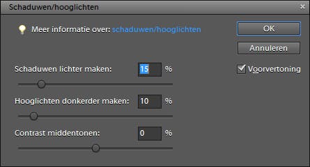 Vaak zal de belichting nu een stuk beter zijn, tenzij u in de foto extreem lichte of donkere delen hebt zitten. Dan kan het gebeuren dat één van beide nog een probleemgebied is. U kunt ze los van elkaar aanpakken via Verbeteren / Belichting aanpassen / Schaduwen/hooglichten. Met schuifregelaars kunt u nu de schaduwen lichter maken of de hooglichten donkerder. Houd wel in de gaten of er voldoende contrast blijft tussen de lichte en donkere tinten. Het gevaar met deze functie bestaat namelijk dat de foto contrastarm wordt en dat is niet de bedoeling.