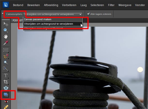 Soms zien we pas op de foto dat de horizon niet recht loopt. Gelukkig is dat makkelijk te herstellen met het gereedschap Rechttrekken (sneltoets P). Sleep met ingedrukte muisknop een lijn in de foto langs iets waarvan u weet dat het horizontaal hoort te zijn. Dat is het gemakkelijkst als er een horizon in beeld is, of wanneer er een rij gebouwen of bomen staat waarvan u weet dat ze zich even ver van u bevonden. Staat de foto na het loslaten van de muisknop juist schuiner in plaats van recht, hef de bewerking dan op met Ctrl+Z en doe een nieuwe poging. Kiest u bovenin voor de canvasoptie Uitsnijden om achtergrond te verwijderen, dan wordt de foto na het roteren automatisch bijgesneden zodat er geen witte randen ontstaan.