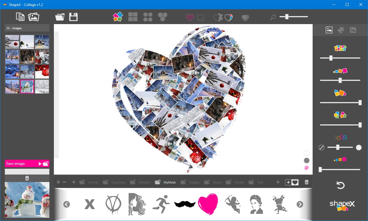 Je vindt ShapeX op www.reasyze.com/shapex, zowel in installeerbare als in portable vorm. Start de tool op en klik op Load Images. De geselecteerde foto’s verschijnen in het linkerpaneel. Selecteer vervolgens een geschikte collagevorm in een van de beschikbare rubrieken onderaan (zoals Numbers, Text, Animals enz.).