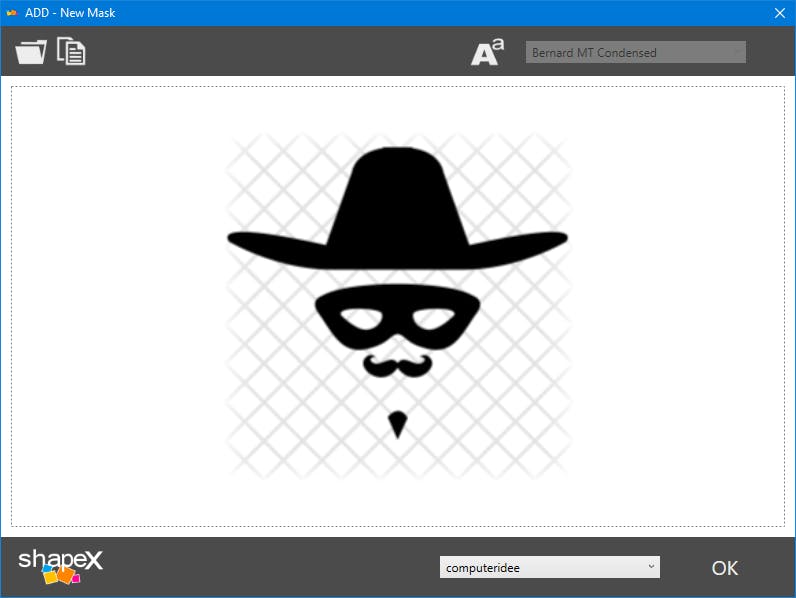 Het is ook mogelijk eigen collagemaskers toe te voegen. Klik links boven de collagebalk op het plusknopje, vul een rubrieksnaam in en bevestig met het vinkje. Open de rubriek en klik rechts boven de collagebalk op het plusknopje. Je kunt nu tekst intikken (tot tien letters) met een geschikt lettertype of via het mapicoon naar een afbeelding verwijzen, waarvan de contouren dan als masker zullen worden gebruikt.