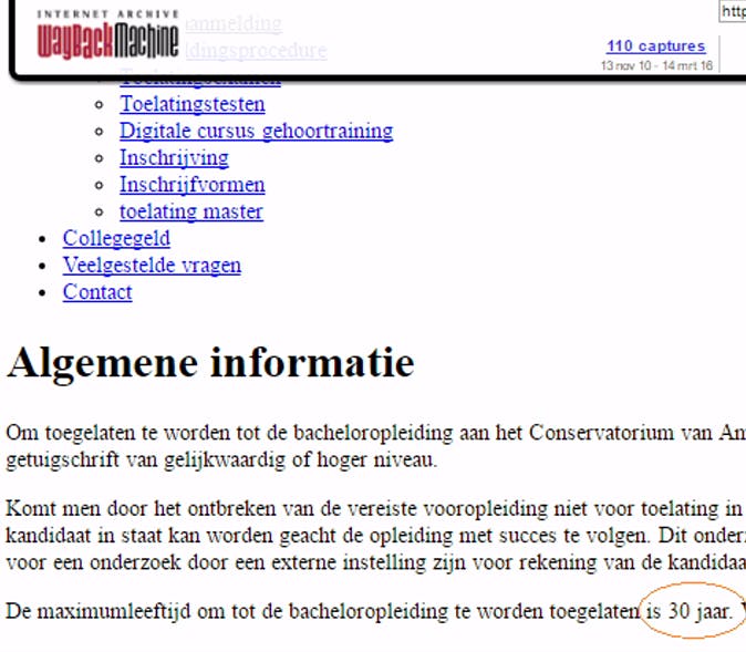 Waarom is de Wayback Machine handig? Omdat er organisaties zijn die informatie verwijderen van hun website op een moment dat het hen gunstig uitkomt. Zo had het Conservatorium in Den Haag op de toelatingspagina staan dat je je aan mag melden tot je 30ste. Als je ouder bent kom je niet in aanmerking. Na een klacht was ineens het zinnetje over de leeftijdsgrens van de pagina verdwenen... maar via de Wayback Machine was het gewoon nog te vinden: