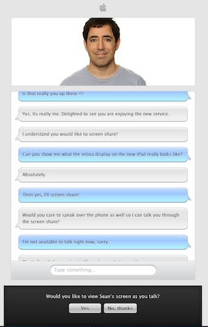 Apple experimenteert met een nieuwe service in de online Apple Store. Gebruikers kunnen via internet met Genius Bar-medewerkers in gesprek gaan en door hen door de online winkel geleid worden.
