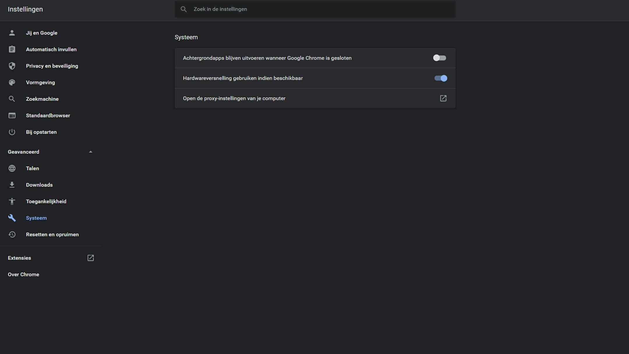 Open Chrome-instellingen en ga naar Geavanceerd en Systeem. Sleep de schuifregelaar bij Achtergrondapps blijven uitvoeren wanneer Google Chrome is gesloten naar links. Is hij grijs? Dan staat deze optie (al) uit.