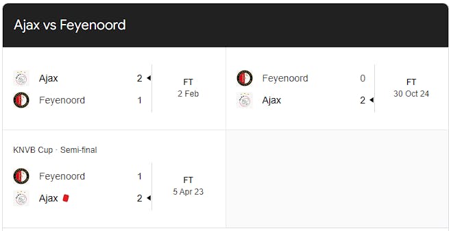 ⚽ Sportfanaat? Ben je een voetbalfanaat of liefhebber van een andere sport? Voer dan gewoon een aankomende wedstrijd of evenement in Google Chrome in, bijvoorbeeld "Ajax-Feyenoord". Je ziet dan meteen wanneer de volgende wedstrijd tussen de clubs is en wat de recente uitslagen zijn.