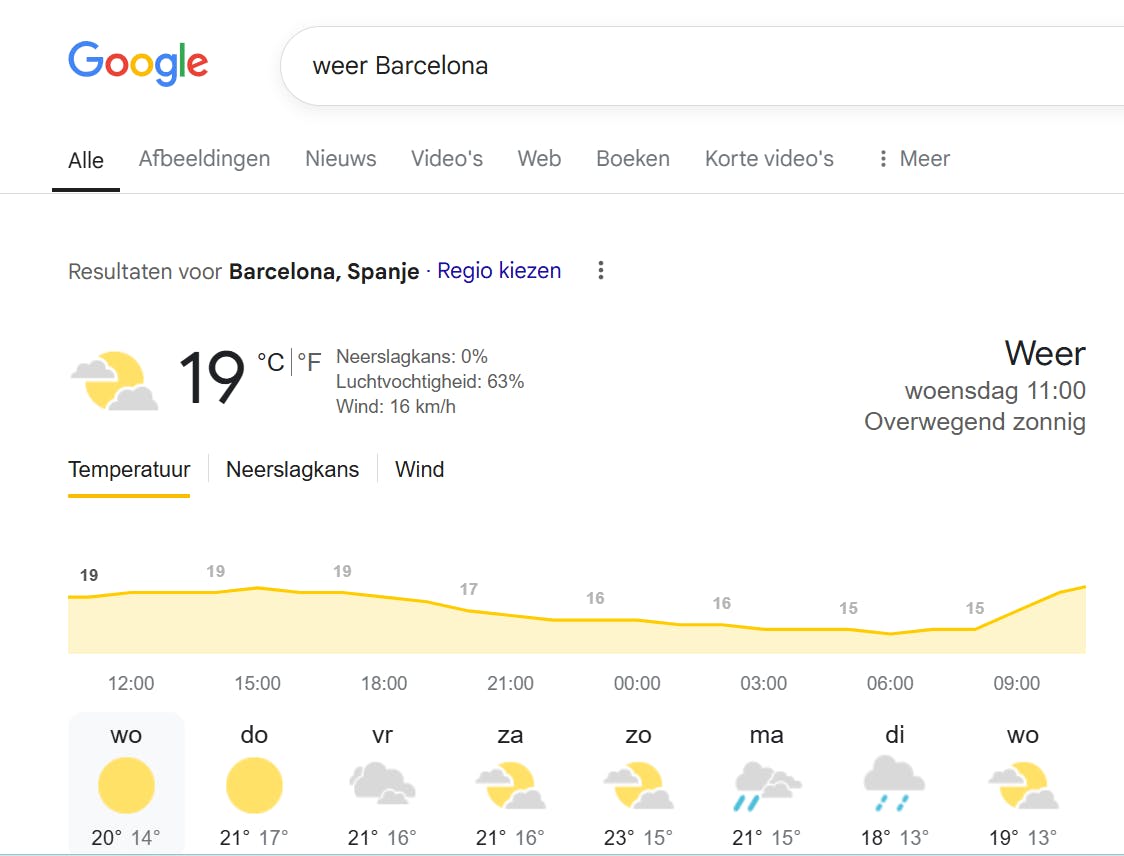 Door eenvoudigweg weer in de adresbalk in te voeren, krijg je het weerbericht van je huidige locatie te zien. Tenminste, zolang je Google toegang geeft tot je locatie. Je kunt er ook een specifieke locatie aan toevoegen. Ga je op vakantie? Typ dan bijvoorbeeld weer Barcelona in voor een weerbericht van die stad.