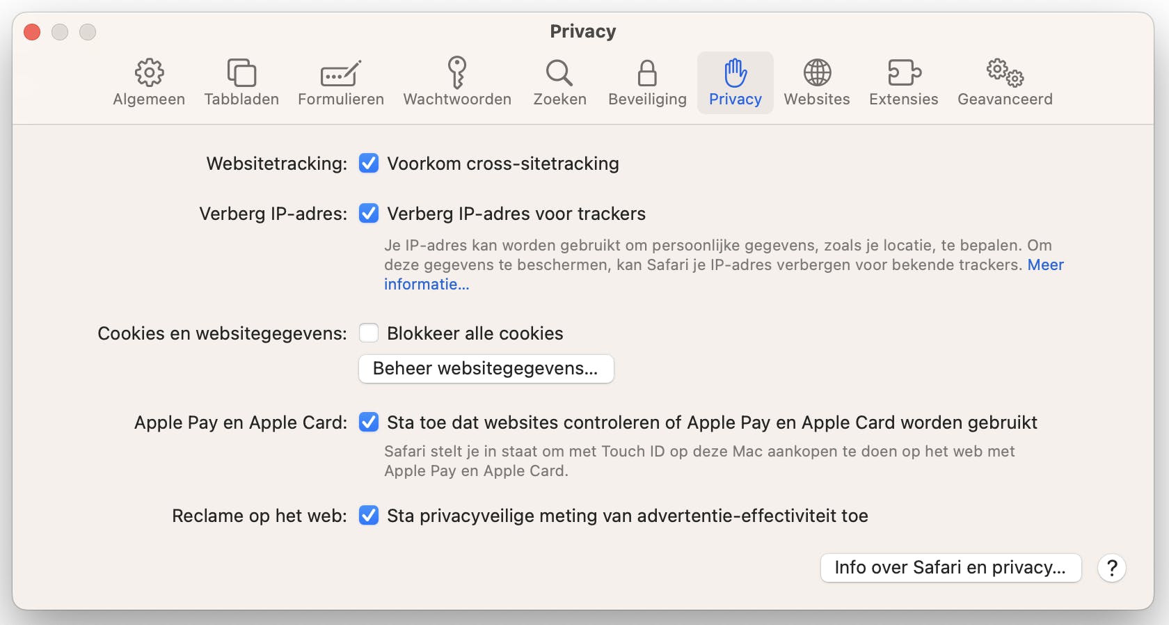 Ook de instellingen onder Privacy zijn de moeite waard om even door te nemen. Standaard staan de eerste twee opties aangevinkt: cross-sitetracking (waarbij je gevolgd kan worden als je van de ene naar de andere website gaat) wordt voorkomen en je ip-adres wordt geblokkeerd voor bekende trackers om je privacy te waarborgen.