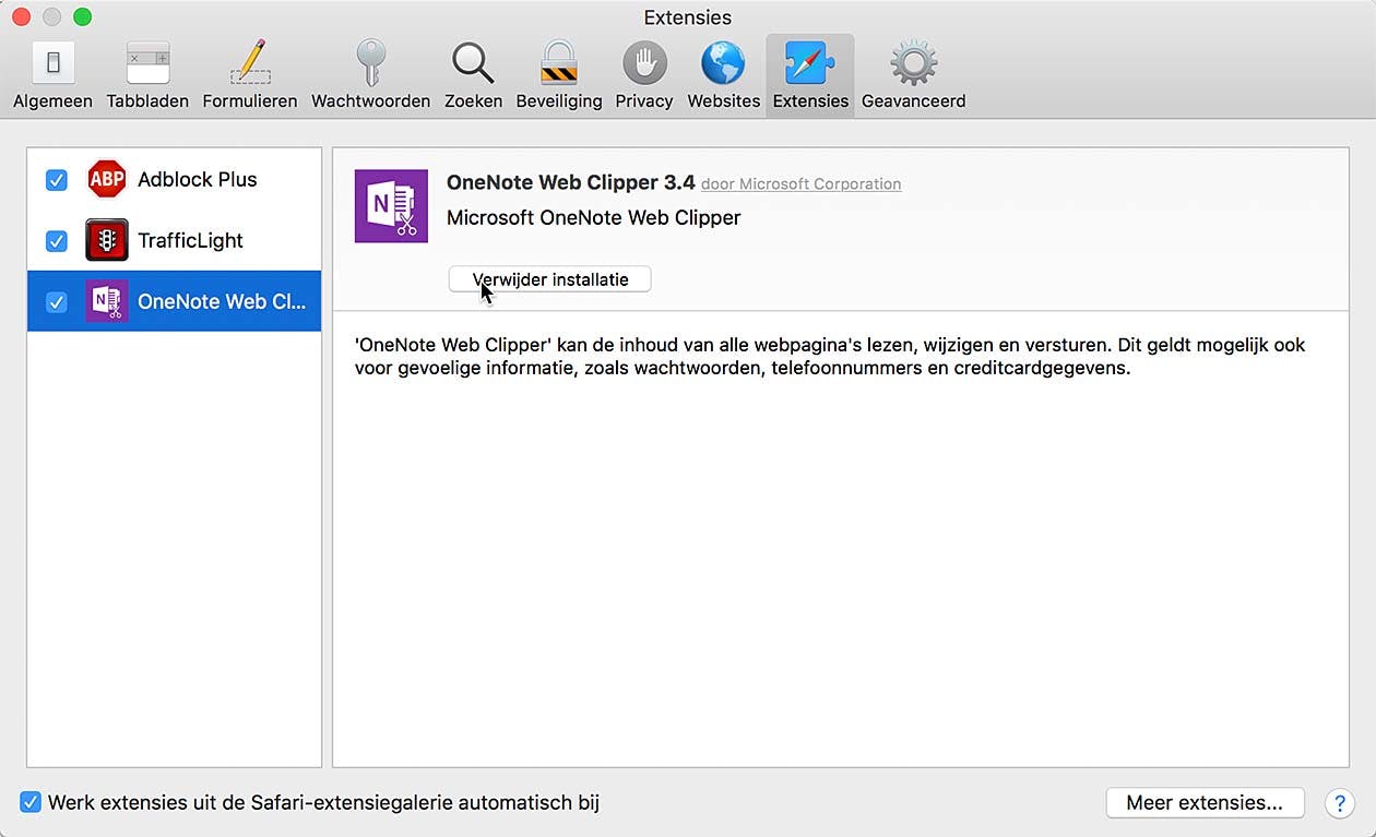 Om een eerder geïnstalleerde add-on te verwijderen klik je in de menubalk van Safari onder Safari op Voorkeuren. Klik in het geopende venster op de knop Extensies. Selecteer aan de linkerkant de extensie die je kwijt wilt en daarna rechts op de knop Verwijder installatie. Bevestig deze actie het geselecteerde exemplaar wordt verwijderd (je vindt het terug in de Prullenbak). Overigens adviseren we je om alleen extensies te installeren die je ook echt veel gebruikt. Elke uitbreiding kan natuurlijk voor problemen zorgen en wat ons betreft is de stabiliteit van een een stuk basisgereedschap als een browser belangrijker dan een hele berg nauwelijks gebruikte add-ons.