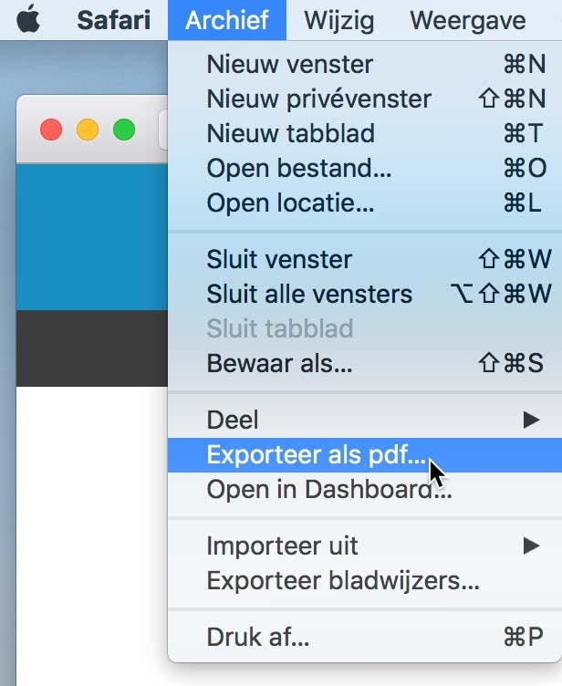 Safari biedt je de mogelijkheid om webpagina's op te slaan als PDF-bestand. De layout van de betreffende pagina blijft daarbij vaak net wat beter bewaard dan wanneer je een PDF maakt vanuit het afdrukvenster. Om een PDF'je van een geopende pagina te maken klik je in de menubalk van Safari onder Bestand op Exporteer als pdf. Geef het bestand een logische naam en bewaar het. Op die manier leg je snel een archief aan van voor jou belangrijke informatie. Handig voor als een pagina eens offline gehaald wordt, zo heb je dan zelf nog een kopie achter de hand in een zeer universeel toegankelijk bestandsformaat.