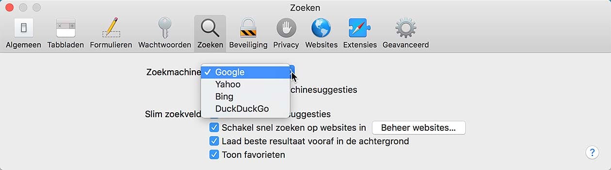 Standaard maakt Safari gebruik van Google als zoekmachine. Wil je iets anders, dan kan dat. Klik in de menubalk van Safari onder Safari op Voorkeuren. Klik in het geopende venster op de knop Zoeken. Via het selectiemenu achter Zoekmachine kies je nu iets van je gading. Bijvoorbeeld Bing of Yahoo. Erg interessant is DuckDuckGo, de zoekmachine die bekend staat om zijn hoge mate van privacy. De zoekresultaten zijn een samenraapsel van allerlei zoekmachines, maar ook indexeert de dienst zelf. Mocht je het 'volggedrag' van zoekgigant Google niet helemaal weten te waarderen, dan is dit een goed alternatief.