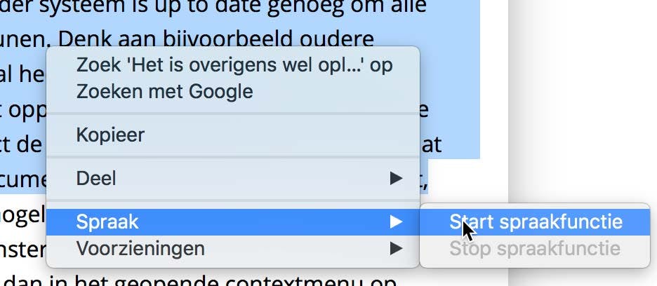 Het is mogelijk om tekst op een pagina in Safari voor te laten lezen. Selecteer eerst een stuk tekst en klik daar vervolgens met de rechter muisknop op (of Control-klik). Selecteer in het geopende contextmenu onder Spraak de optie Start spraakfunctie. Heb je per ongeluk een te lange lap tekst geselecteerd of blijkt het allemaal toch niet zo interessant te zijn, dan vind je hier ook meteen de stop-optie.