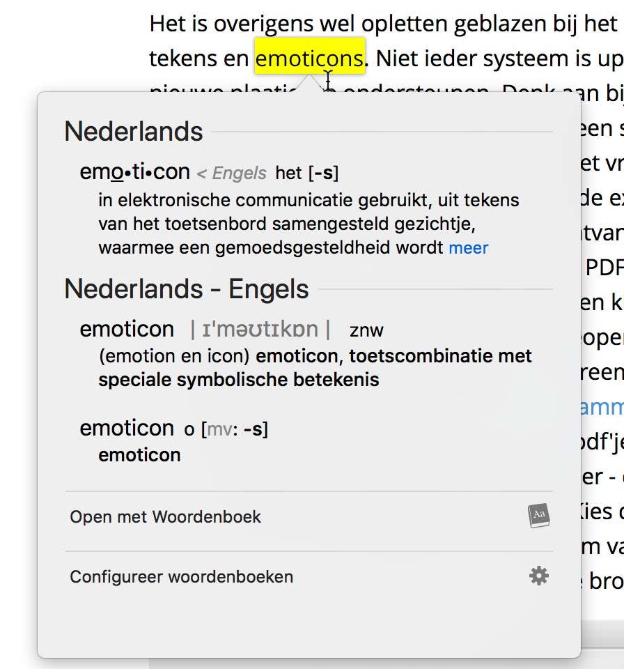 Kom je eens een woord tegen op een pagina waarvan je de betekenis niet kent? Geen nood! Selecteer het en klik er vervolgens met de rechter muisknop op (of Control-klik). Klik dan in het geopende contextmenu de optie Zoek 'xxxx' op, waarbij xxxx staat voor het geselecteerde woord. Grote kans dat je nu een ballon met een woordenboekfragment te zien krijgt, afkomstig van het in macOS ingebouwde woordenboek.