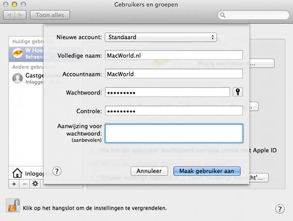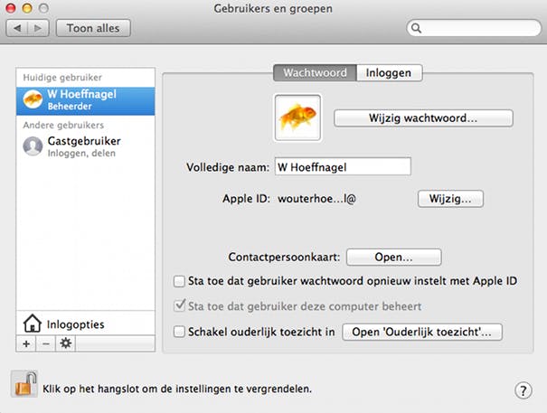 Iedere Mac bevat standaard tenminste één account, die je tijdens de installatie van de machine hebt aangemaakt. Dit account heeft beheerdersrechten op de Mac en is daarom in staat accounts voor andere gebruikers aan te maken. Ga hiervoor naar Systeemvoorkeuren en open het menu Gebruikers en groepen. Je krijgt nu een overzicht te zien van alle accounts die op dit moment op je Mac aanwezig zijn.
