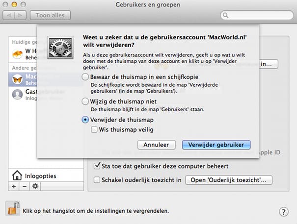 Het is ook mogelijk ouderlijk toezicht op een later moment aan een account toe te voegen of aan te geven dat een gebruikers de computer wel of juist niet mag beheren. Wil je een account in zijn geheel verwijderen? Selecteer dan het account en klik op de - aan de linkerkant van het venster.