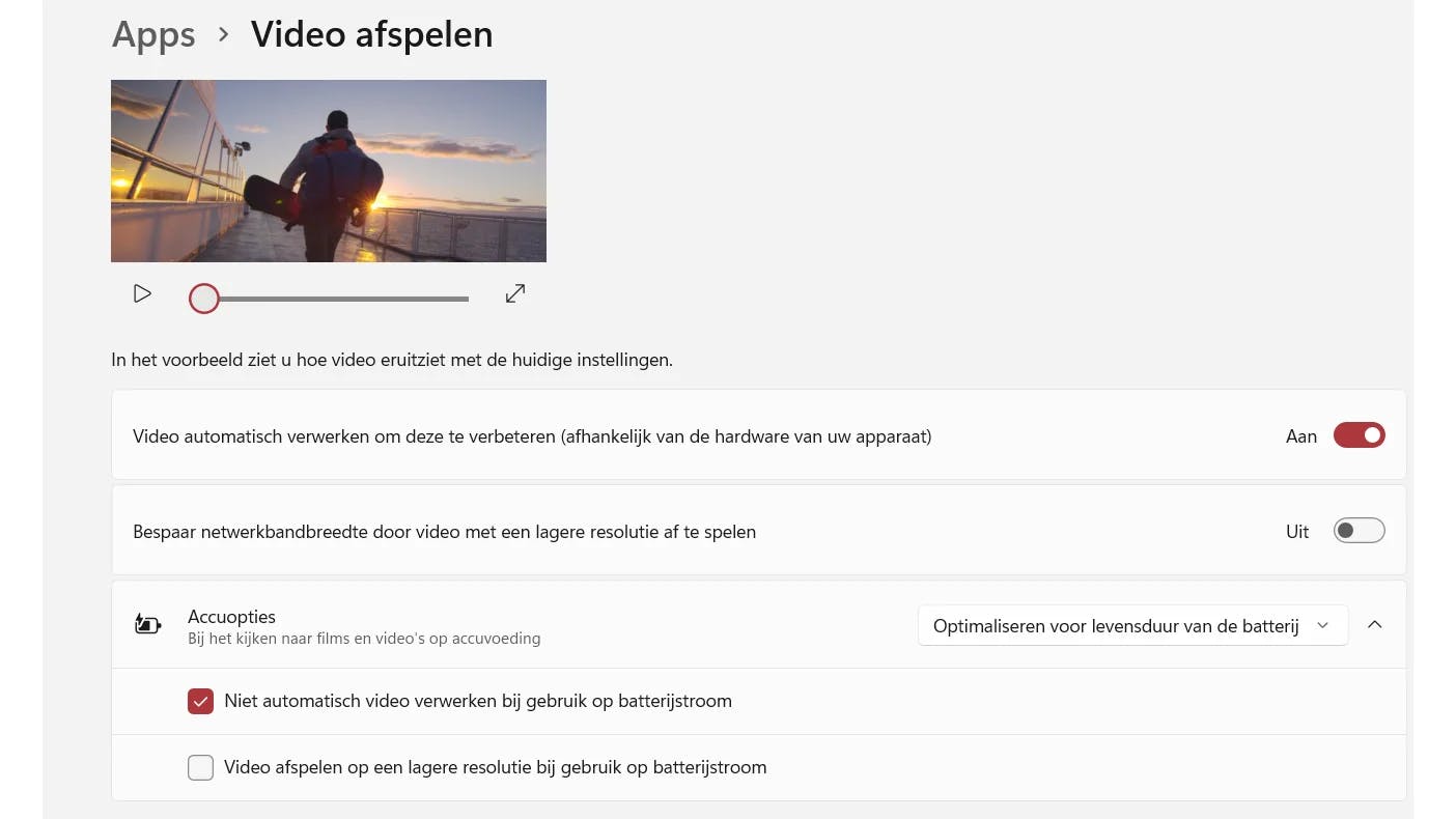 Open de Instellingen met Win+I, klik in de linkerkolom op Apps en kies de voorlaatste optie: Video afspelen. Hier kun je aangeven of je video's in een hogere of lagere resolutie wilt afspelen. De bovenste optie Video automatisch verwerken om deze te verbeteren staat standaard uit. Als je die activeert, krijg je een hogere kwaliteit maar verbruik je meer bandbreedte. De tweede optie, Bespaar netwerkbandbreedte door video met een lagere resolutie af te spelen, is handig bij een trage internetverbinding. Door deze optie in te schakelen, voorkom je dat video's voortdurend bufferen of haperen. Bovenaan dit menu vind je een voorbeeldvideo waarmee je meteen het effect van de aanpassing kunt bekijken.